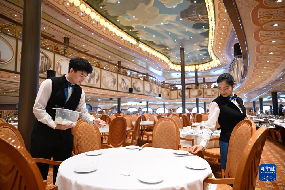 9月27日,中國船舶集團旗下愛達郵輪“地中?!碧栢]輪工作人員在郵輪餐廳忙碌。