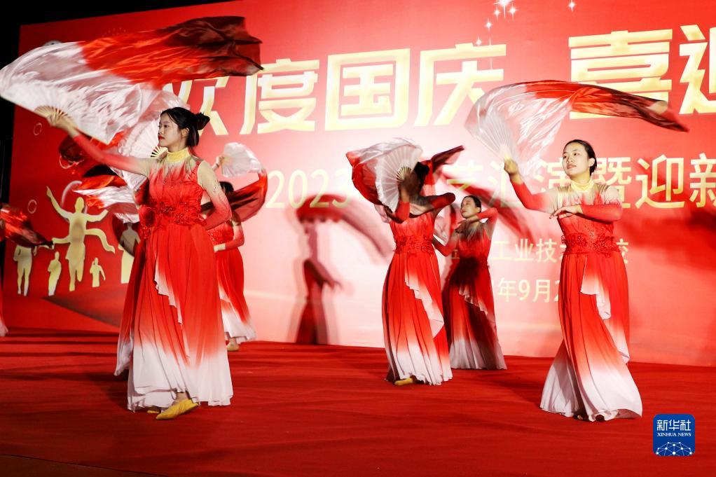 9月26日,學生在山東省青島市工業技術學校“迎國慶”主題晚會上表演舞蹈。