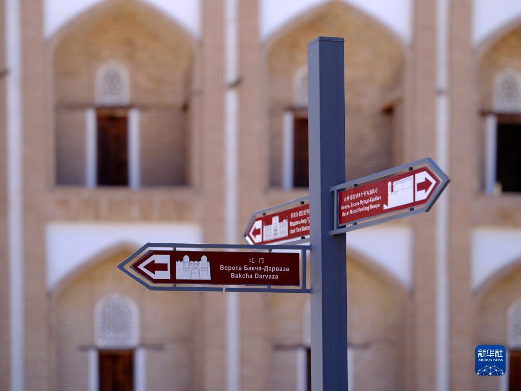 這是9月22日在烏茲別克斯坦花拉子模州的希瓦古城拍攝的古建筑路標。路標指示出阿米爾·圖拉經學院和哈桑·穆拉德庫什別吉清真寺的位置,并有中文標示。
