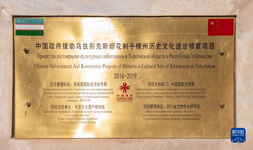 這是9月22日在烏茲別克斯坦花拉子模州的希瓦古城拍攝的“中國政府援助烏茲別克斯坦花剌子模州歷史文化遺跡修復(fù)項目”紀(jì)念牌。