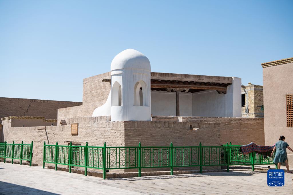 9月22日,在烏茲別克斯坦花拉子模州的希瓦古城,一名婦女從修復一新的哈桑·穆拉德庫什別吉清真寺外走過。