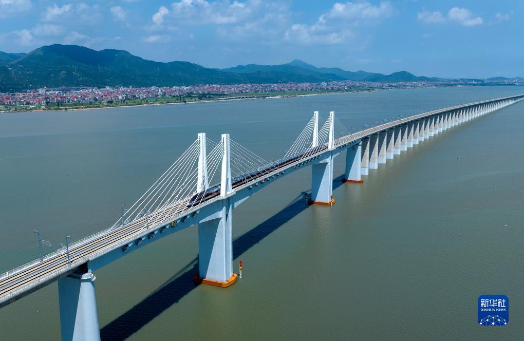 一列復興號智能配置動車組駛過湄洲灣跨海大橋(9月19日攝,無人機照片)。