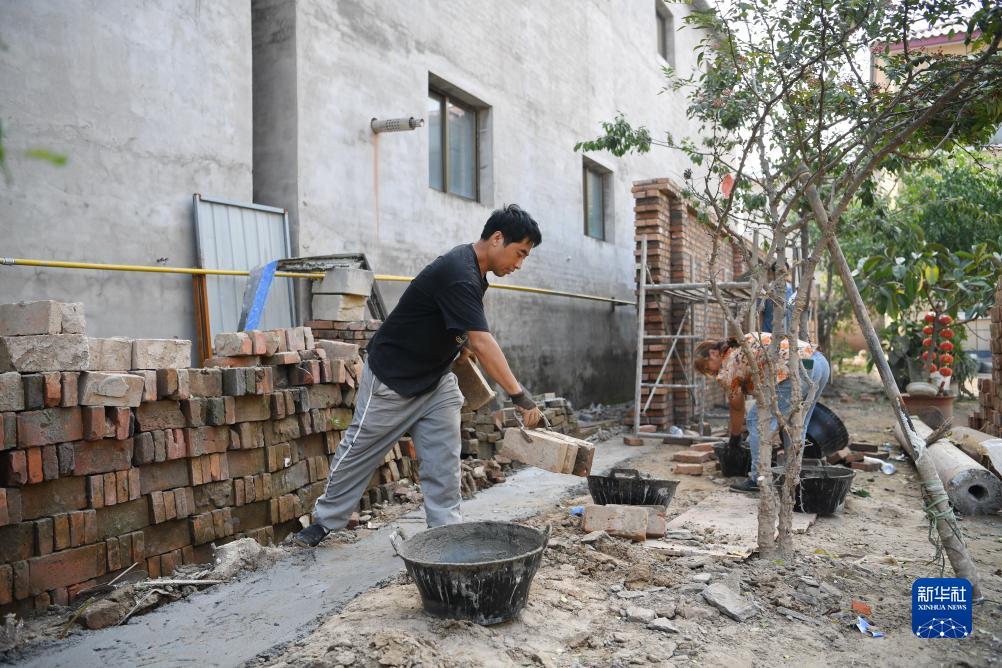 9月26日,工人在河北保定涿州市刁窩鎮(zhèn)刁四村一處受損房屋修復現(xiàn)場搬運磚塊。