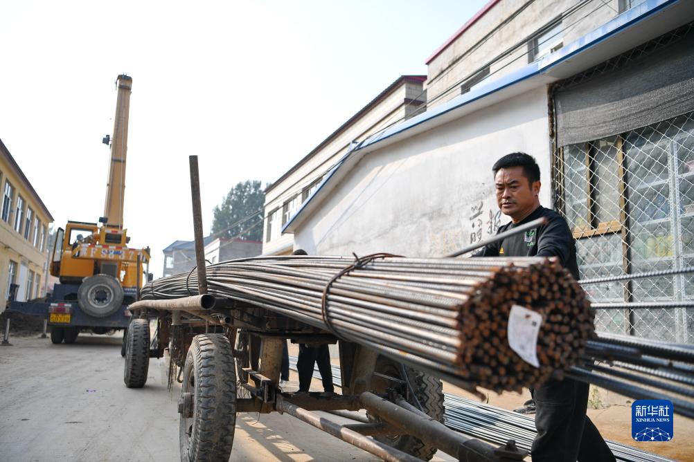 9月26日,工人在河北保定涿州市刁窩鎮(zhèn)刁四村一處受損房屋修復(fù)現(xiàn)場搬運鋼筋。