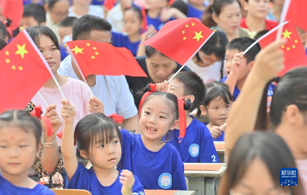 9月28日,在梧州市龍圩區龍圩中心小學,學生們在主題活動中揮舞國旗。