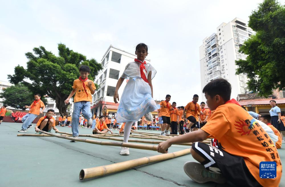 9月28日,在梧州市龍圩區龍圩中心小學,學生們在跳竹竿舞。