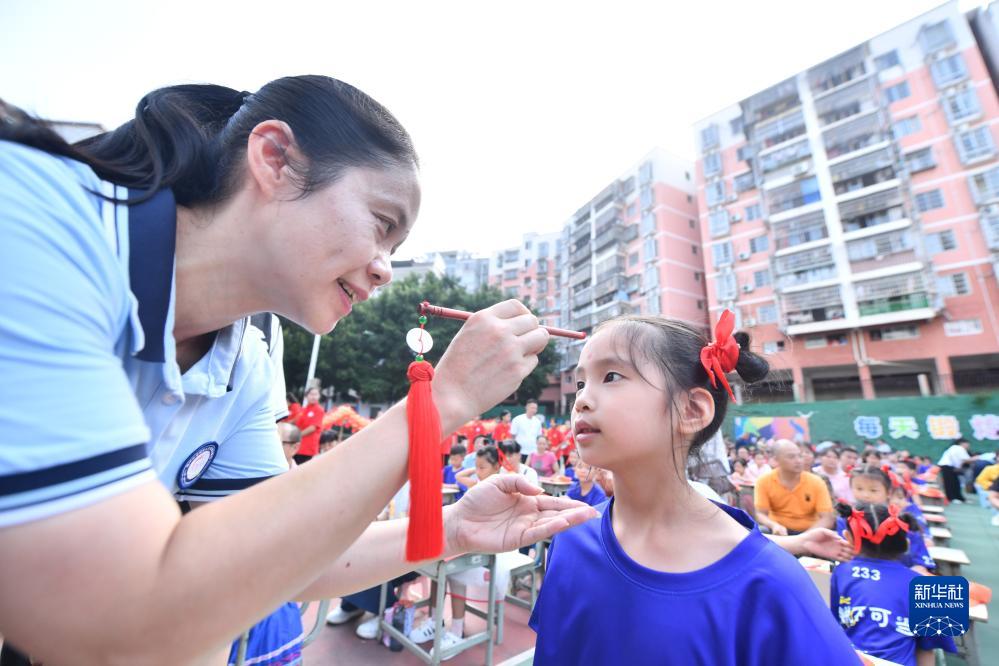 9月28日,梧州市龍圩區(qū)龍圩中心小學老師為一年級新生點朱砂啟智。