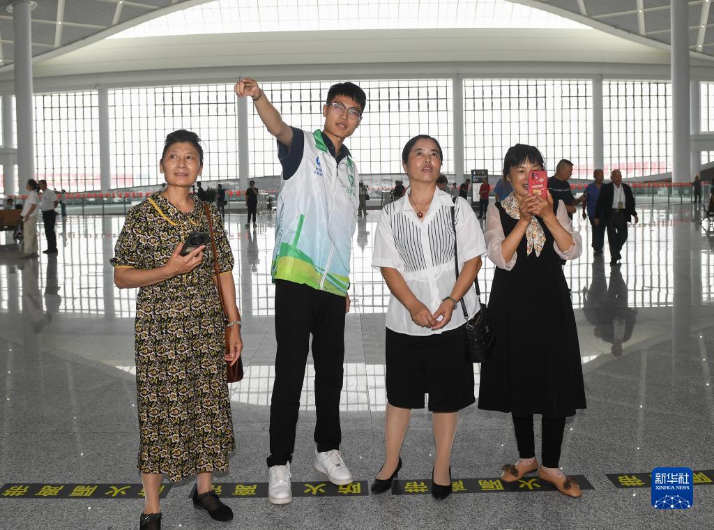 9月28日,承建江陰站的中鐵建工集團職工(左二)在候車大廳為群眾介紹站房特點。