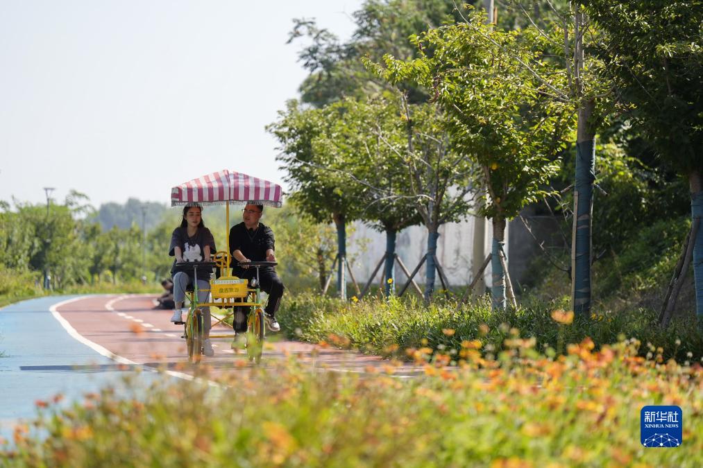9月28日,市民在河北省樂亭縣古灤河生態(tài)公園內(nèi)騎行。