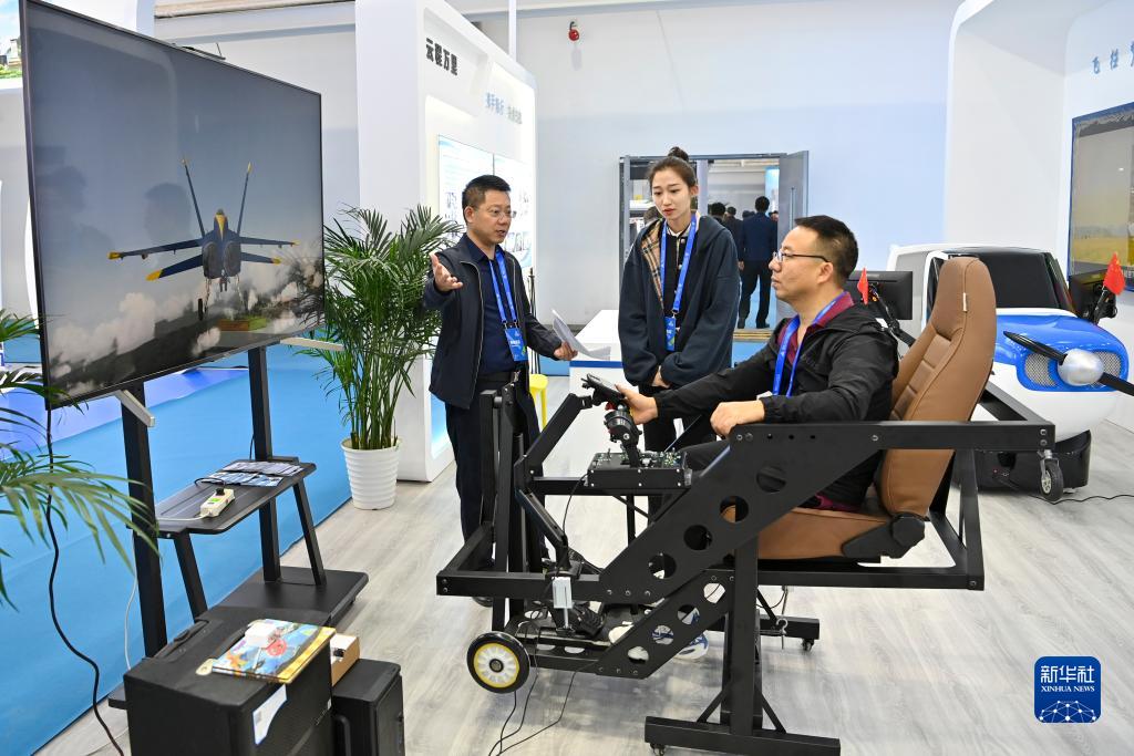 9月28日,參觀者在2023太原國際通用航空博覽會上體驗模擬飛行系統。