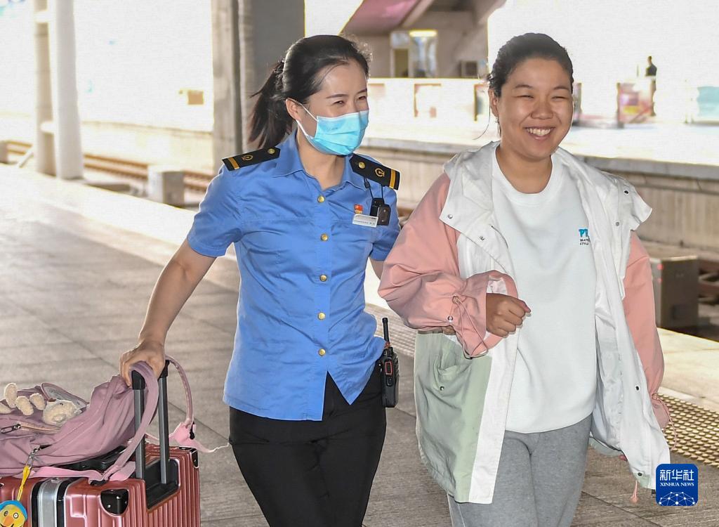 9月28日,長春站“春之約”愛心服務室客運值班員馬叢(左)引導視障旅客上車。