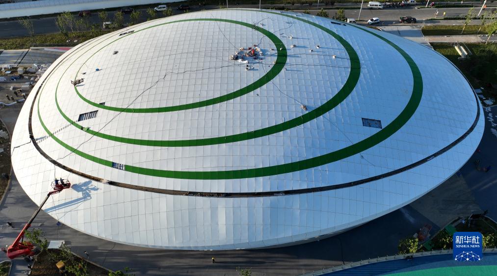 9月30日,建設者在河北省石家莊市高鐵片區(qū)中央綠色體育公園網球館施工。