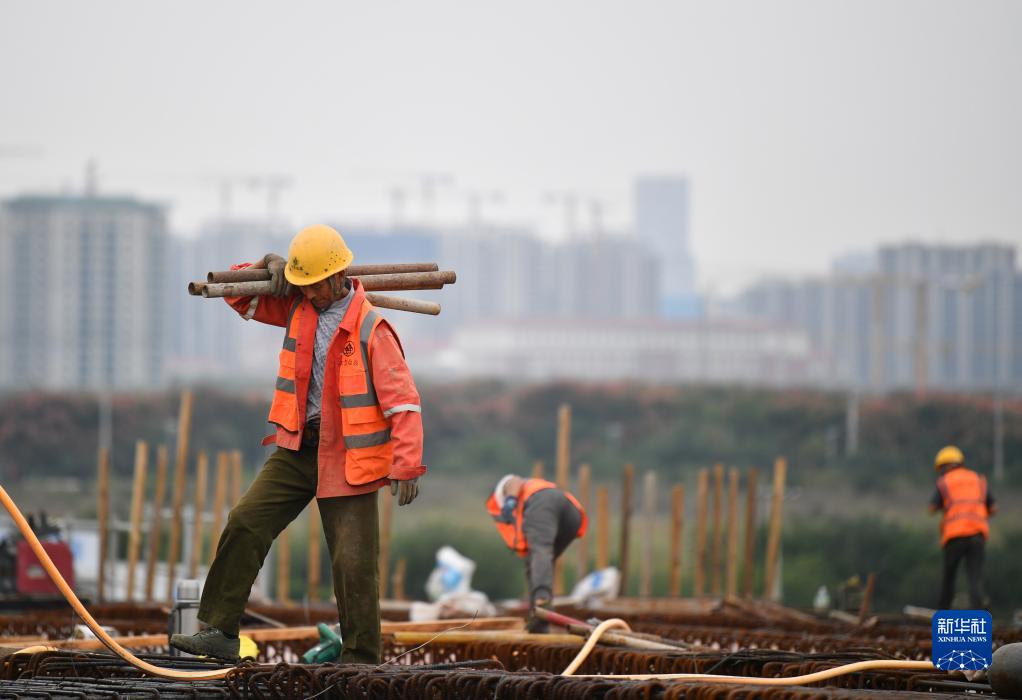 9月30日,中建三局西北公司工人在西安國際港務區歐亞大道上跨貨運北環線高架工程施工。