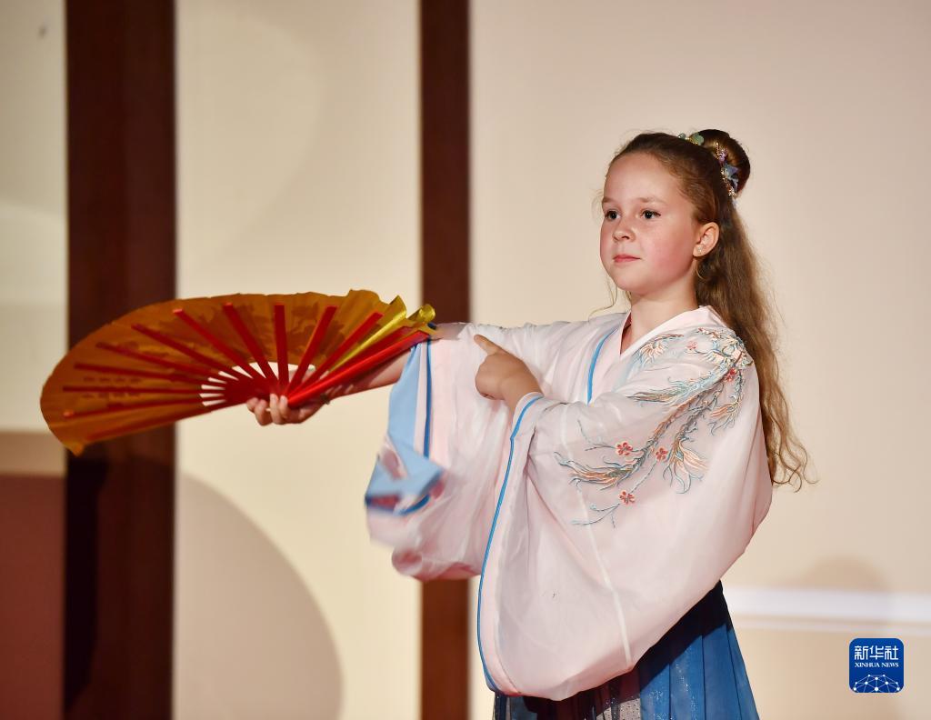 9月29日,在德國漢堡豫園,身著漢服的德國小演員在中秋晚會上表演舞蹈。
