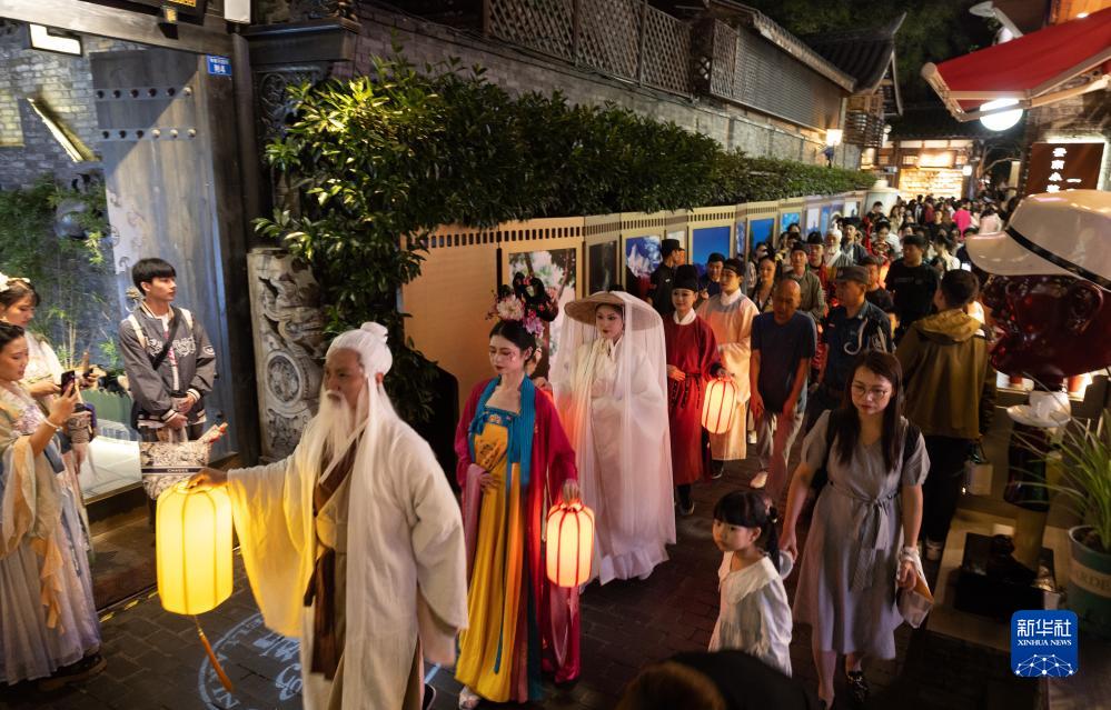 在成都寬窄巷子新“十二月市”街區,裝扮成唐宋時代人物形象的演員在巡游表演(9月29日攝)。