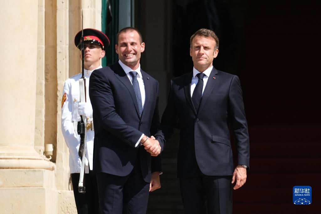 9月29日,在馬耳他瓦萊塔,馬耳他總理阿貝拉(前左)歡迎前來參會(huì)的法國總統(tǒng)馬克龍(前右)。