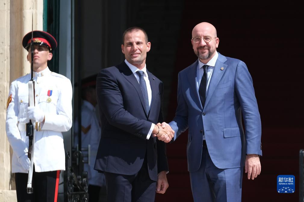 9月29日,在馬耳他瓦萊塔,馬耳他總理阿貝拉(前左)歡迎前來參會(huì)的歐洲理事會(huì)主席米歇爾(前右)。