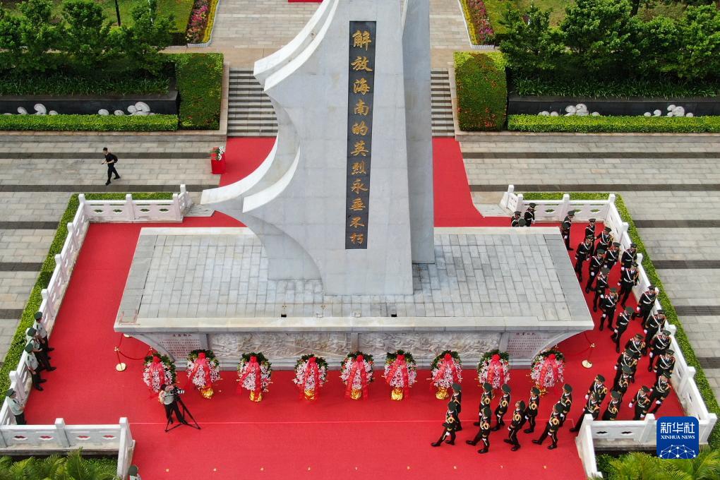 9月30日,武警海南總隊海口支隊官兵在解放海南島戰(zhàn)役烈士陵園瞻仰烈士紀念碑(無人機照片)。