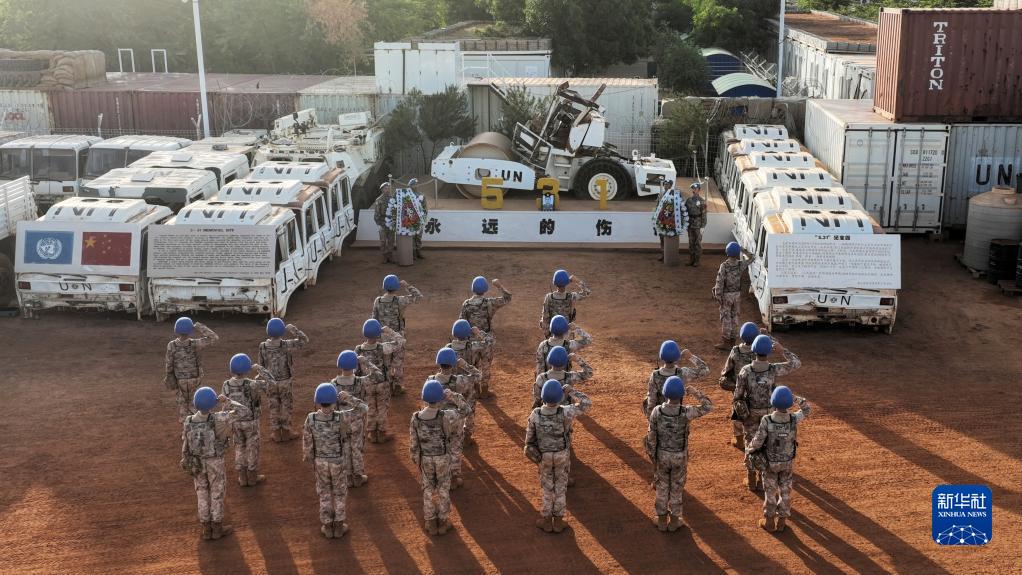 中國第10批赴馬里維和工兵分隊官兵在“5·31烈士紀念園”舉行祭奠英烈儀式,緬懷申亮亮烈士(當地時間9月29日攝)。