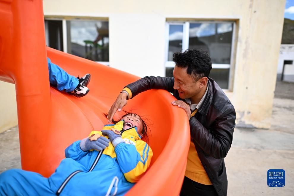 9月13日,青海省玉樹藏族自治州曲麻萊縣秋智鄉幼兒園園長羅松義西在校園內和小朋友一起玩耍。