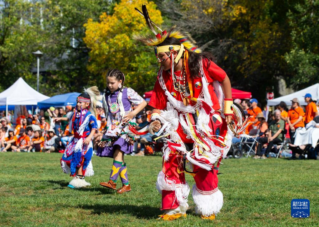 9月30日,身著原住民服飾的兒童在加拿大多倫多舉辦的“全國真相與和解日”紀念活動中表演舞蹈。