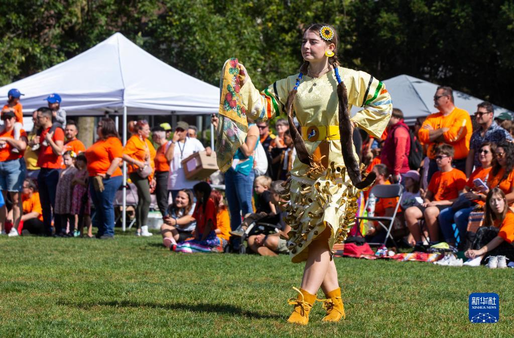 9月30日,一名身著原住民服飾的女孩在加拿大多倫多舉辦的“全國真相與和解日”紀念活動中表演舞蹈。