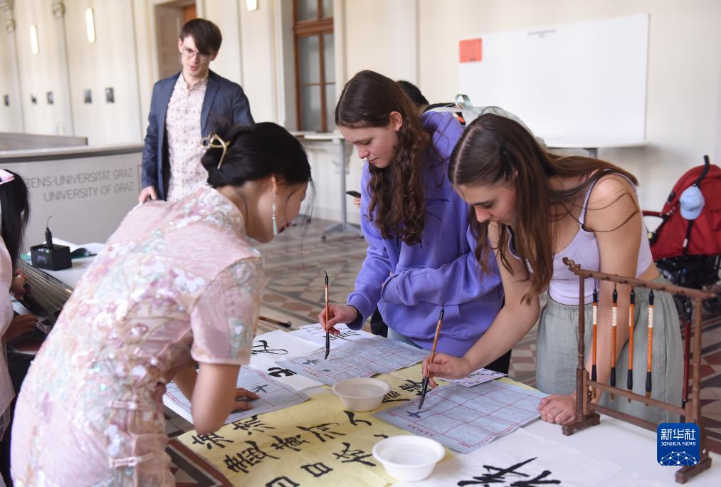 9月30日,在奧地利格拉茨大學(xué)活動(dòng)現(xiàn)場(chǎng),人們體驗(yàn)中國(guó)書法。