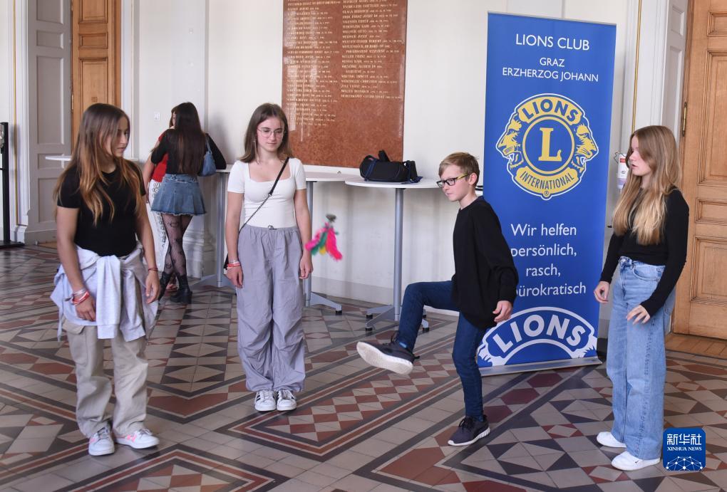 9月30日,在奧地利格拉茨大學活動現場,孩子們體驗踢毽子。