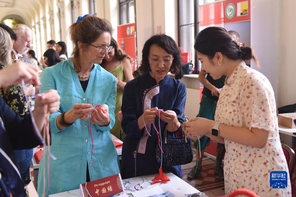 9月30日,在奧地利格拉茨大學(xué)活動(dòng)現(xiàn)場(chǎng),人們體驗(yàn)編織中國(guó)結(jié)。
