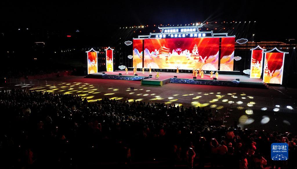 西安大明宮國家遺址公園內進行的“長安之夜”演出(9月30日攝,無人機照片)。