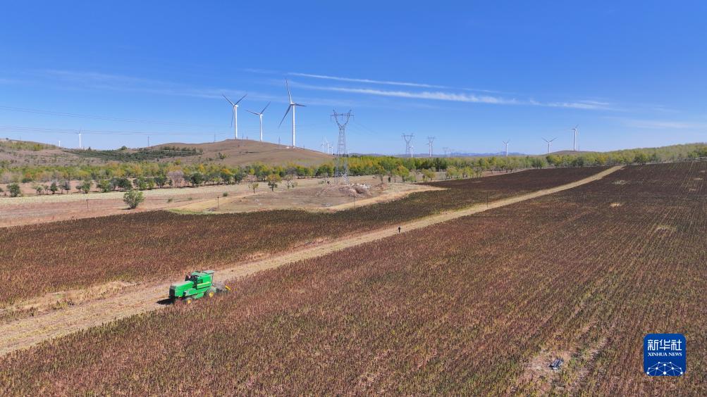 10月1日,在沽源縣白土窯鄉(xiāng)小西溝村,當?shù)剞r(nóng)機手在田間操作收割機收獲藜麥(無人機照片)。