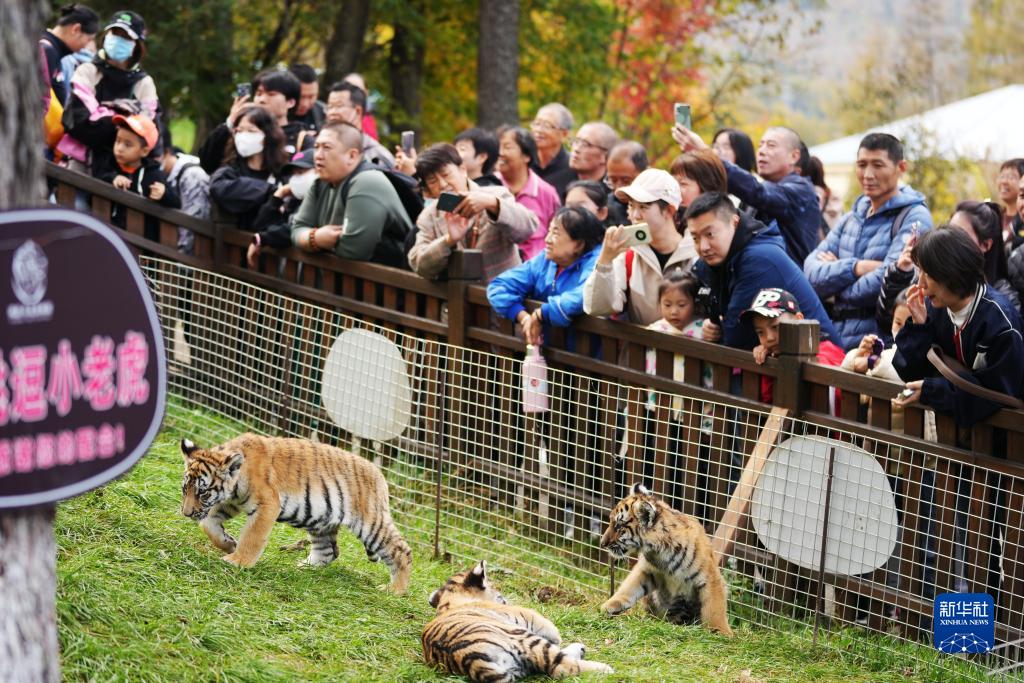 10月1日,在橫道河子東北虎林園,人們在觀賞幼虎。