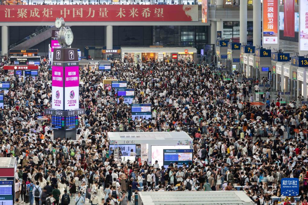 10月1日,上海虹橋火車站候車大廳里人頭攢動。