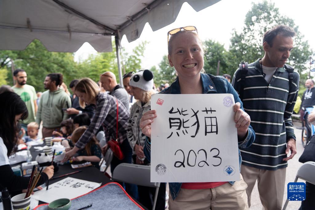 9月30日,在美國華盛頓史密森學會國家動物園,游客體驗大熊貓主題書法活動。