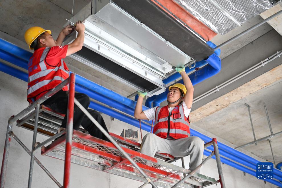 10月1日,中建二局華北公司工人在河北雄安新區容東華望城項目安裝設備。