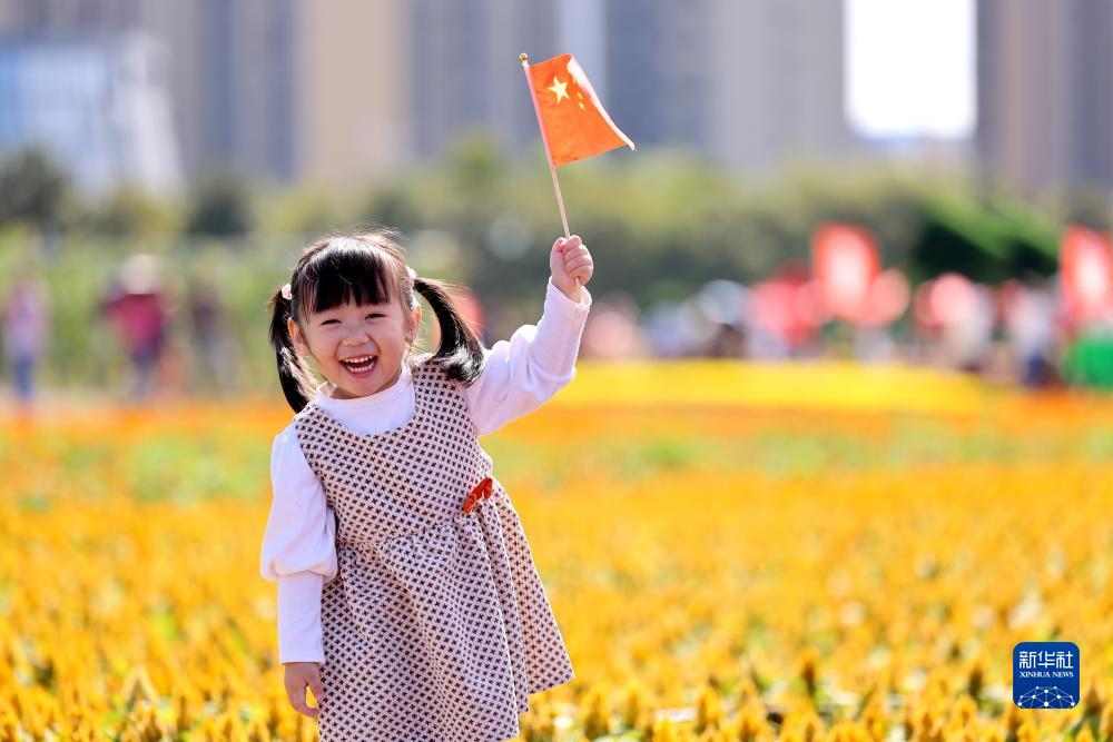 10月1日,小朋友在山東省棗莊市一處花海景點游玩。