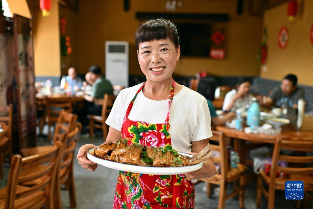 在山西磧口古鎮,村民賈娟展示自家飯店的菜品(8月2日攝)。賈娟原來是磧口古鎮的導游,2011年開始經營飯店。隨著來磧口古鎮旅游的客人逐年增加,賈娟的飯店生意也越來越好。