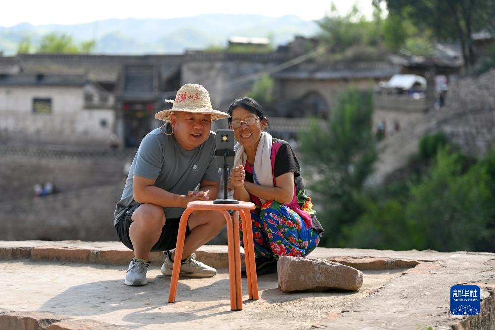 村民陳玉香(右)和兒子李彥軍在直播(8月2日攝)。2021年,陳玉香開始嘗試在網上直播介紹磧口古鎮的美景和美食,很快收獲了20多萬粉絲。