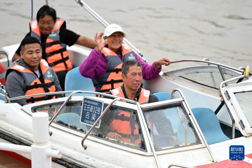 在山西磧口古鎮,村民張保生(前)駕駛快艇在黃河上行駛(9月26日攝)。張保生以前以擺渡為生,開的是木船和鐵船,2000年考了快艇駕駛證。如今,他農忙時種地,農閑時開快艇帶著游客在黃河上觀光,一年能收入3萬多元。