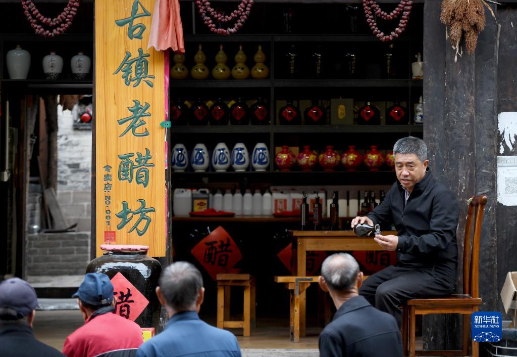 在山西磧口古鎮,張海龍邀請游客品嘗陳醋(9月26日攝)。張海龍之前是卡車司機,2018年,他在磧口古鎮開了一家山西陳醋店,吸引不少游客光顧。
