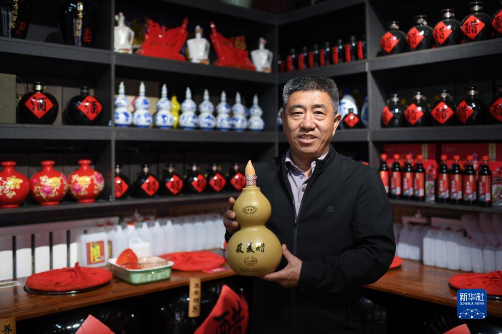 在山西磧口古鎮,張海龍在展示醋產品(9月26日攝)。張海龍之前是卡車司機,2018年,他在磧口古鎮開了一家山西陳醋店,吸引不少游客光顧。