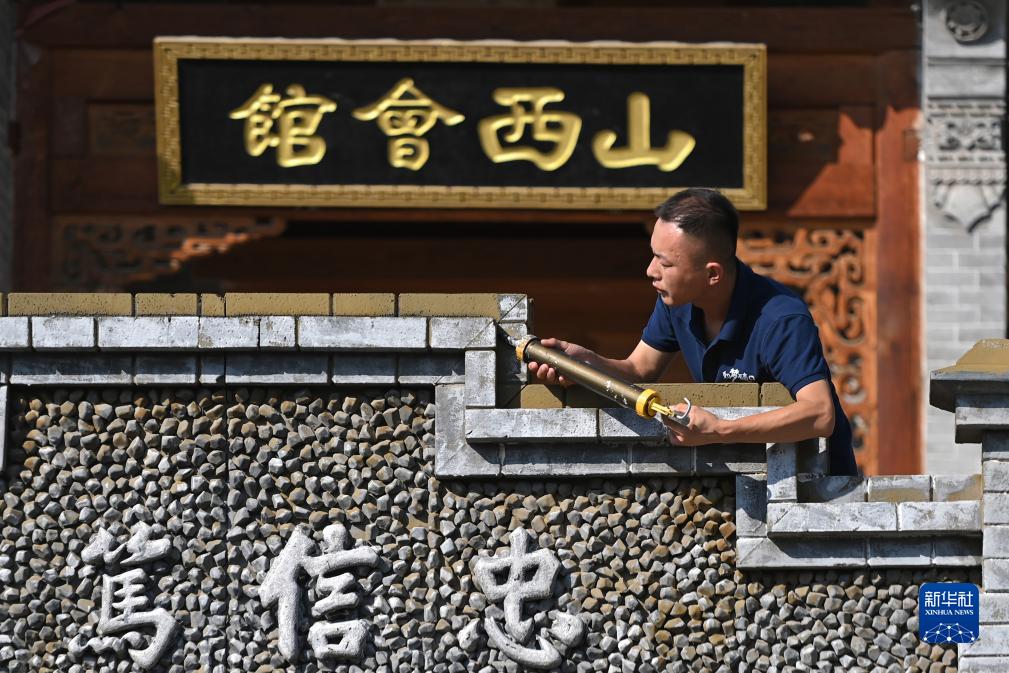村民李探恩在《如夢磧口》劇場忙碌(8月2日攝)。李探恩之前在外打工,2020年9月《如夢磧口》在磧口開演后,他來到劇場做場務工作,每年有5萬多元的收入。