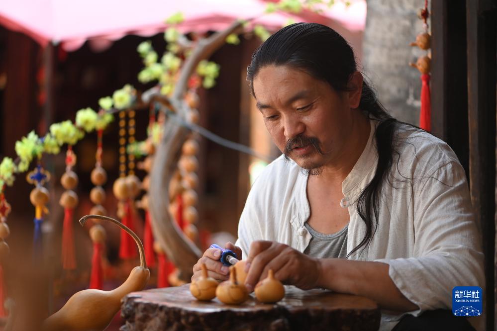 在山西磧口古鎮,閆強強在制作葫蘆工藝品(8月2日攝)。閆強強之前在天津打工,干過汽車維修,擺過地攤。2016年,掌握了葫蘆燙畫工藝的閆強強在磧口古鎮開了一家文創店,靠著賣文創葫蘆,一年收入超過10萬元。