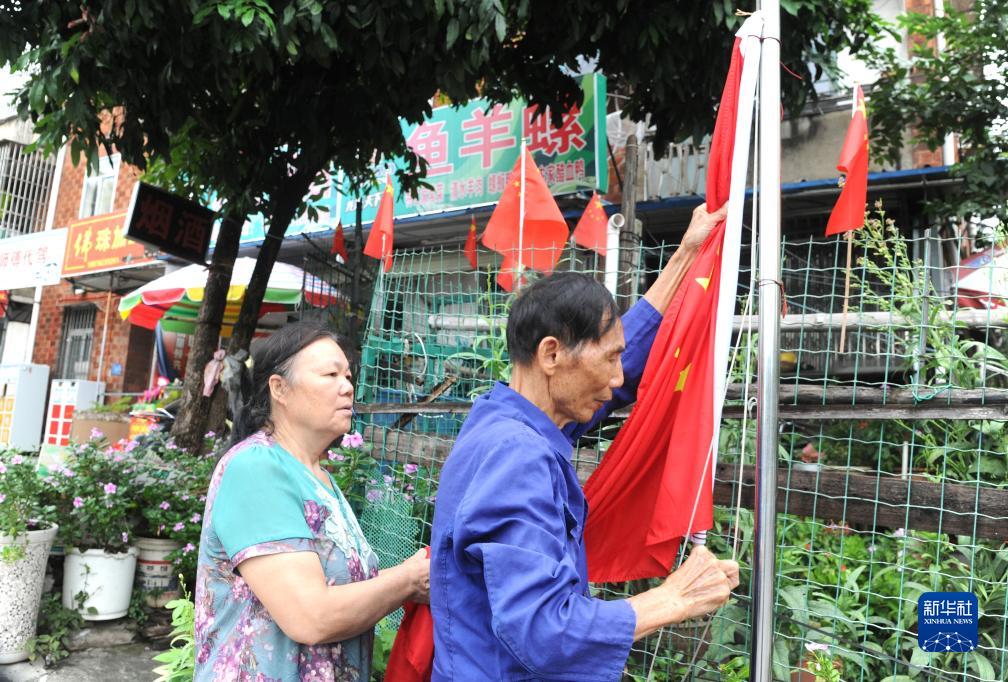 10月2日,梁樂(右)和愛人在自家門口升國旗。