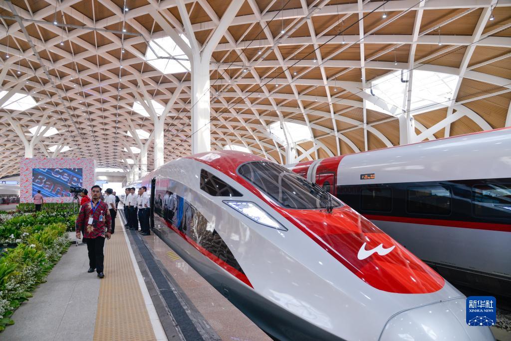 10月2日,在印度尼西亞雅加達哈利姆高鐵站,雅萬高鐵高速動車組停靠在站臺上。