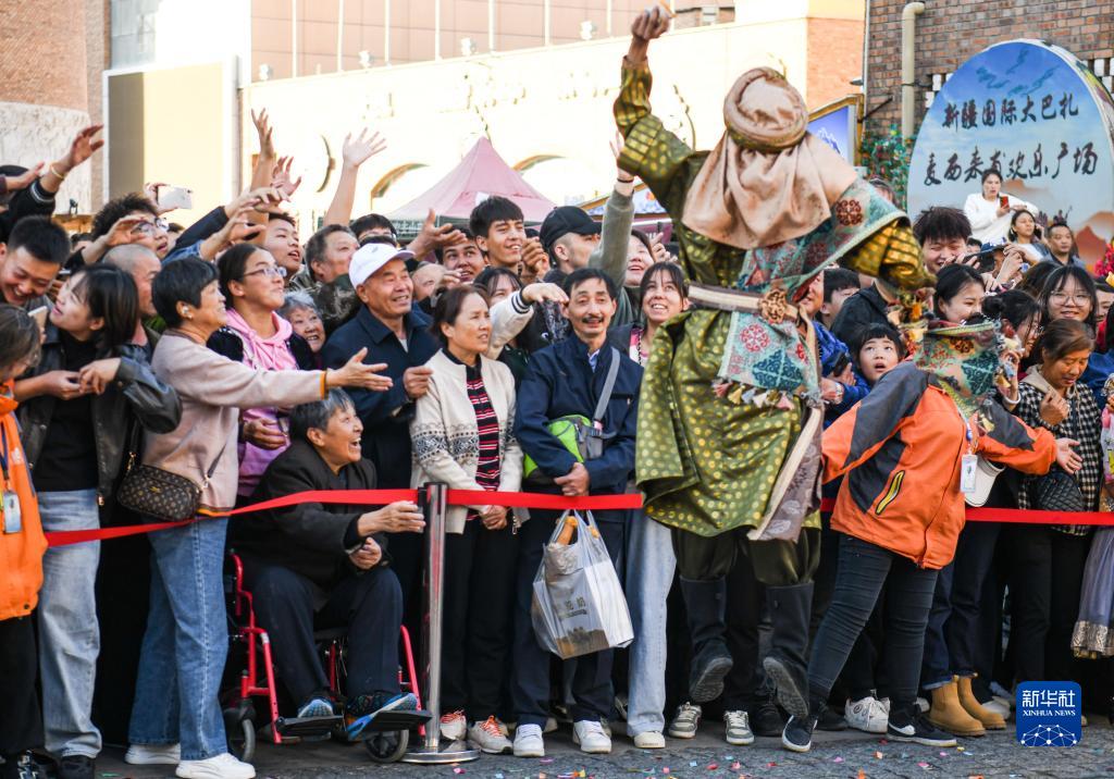 10月2日,在烏魯木齊大巴扎步行街,演員與觀眾互動。