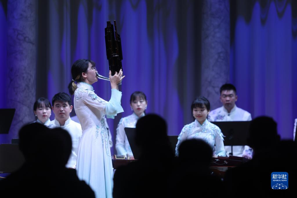 10月2日,在斯洛文尼亞盧布爾雅那的盧布爾雅那大學(xué)音樂學(xué)院,南京大學(xué)民族樂團(tuán)成員表演笙獨(dú)奏。