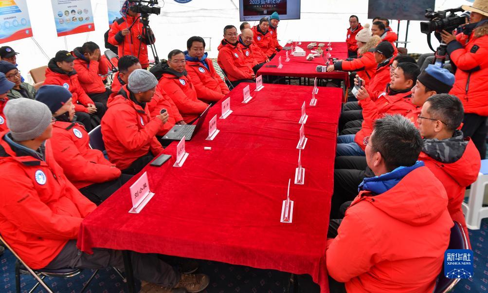 在海拔4950米的卓奧友峰科考大本營,科考隊員趙華標(手拿麥克風者看電腦者)宣讀剛剛接收到的頂峰氣象觀測數據,標志著峰頂自動氣象站架設成功,成功傳回觀測數據(10月1日攝)。