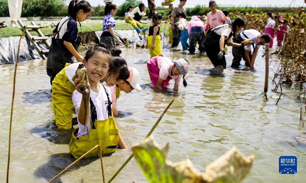 10月3日,小朋友在浙江省寧波市北侖區郭巨街道古鎮蓮園體驗采收蓮藕。