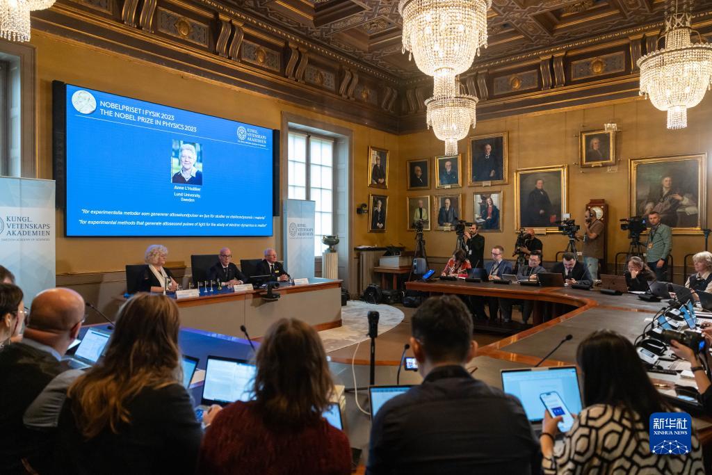這是10月3日在瑞典斯德哥爾摩拍攝的2023年諾貝爾物理學(xué)獎公布現(xiàn)場。